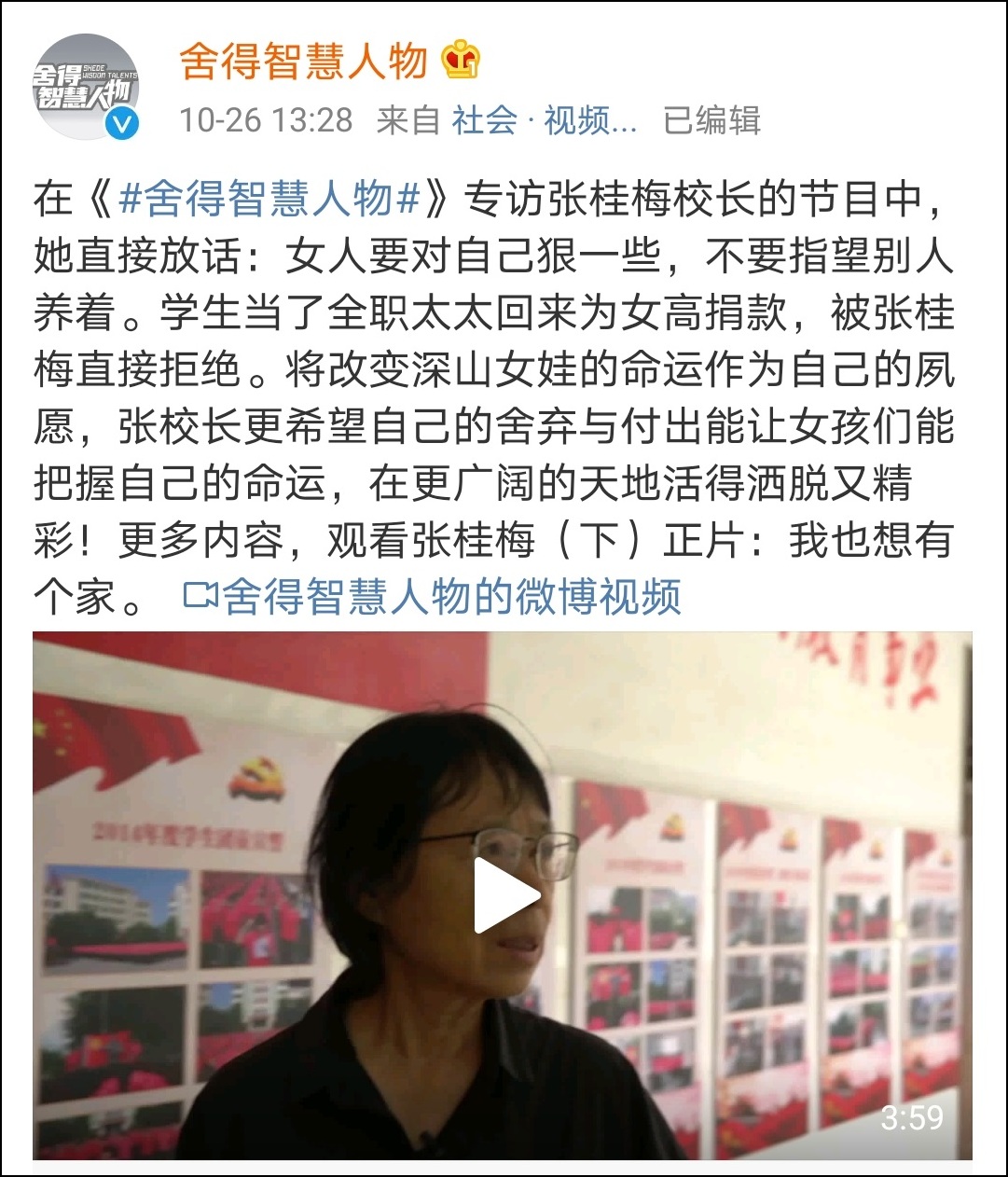 在節目官微分享的一段時長近4分鐘、相對完整的視頻裏,張桂梅其實也提到了那名捐款女學生的家庭狀況和她愛人的經濟條件。