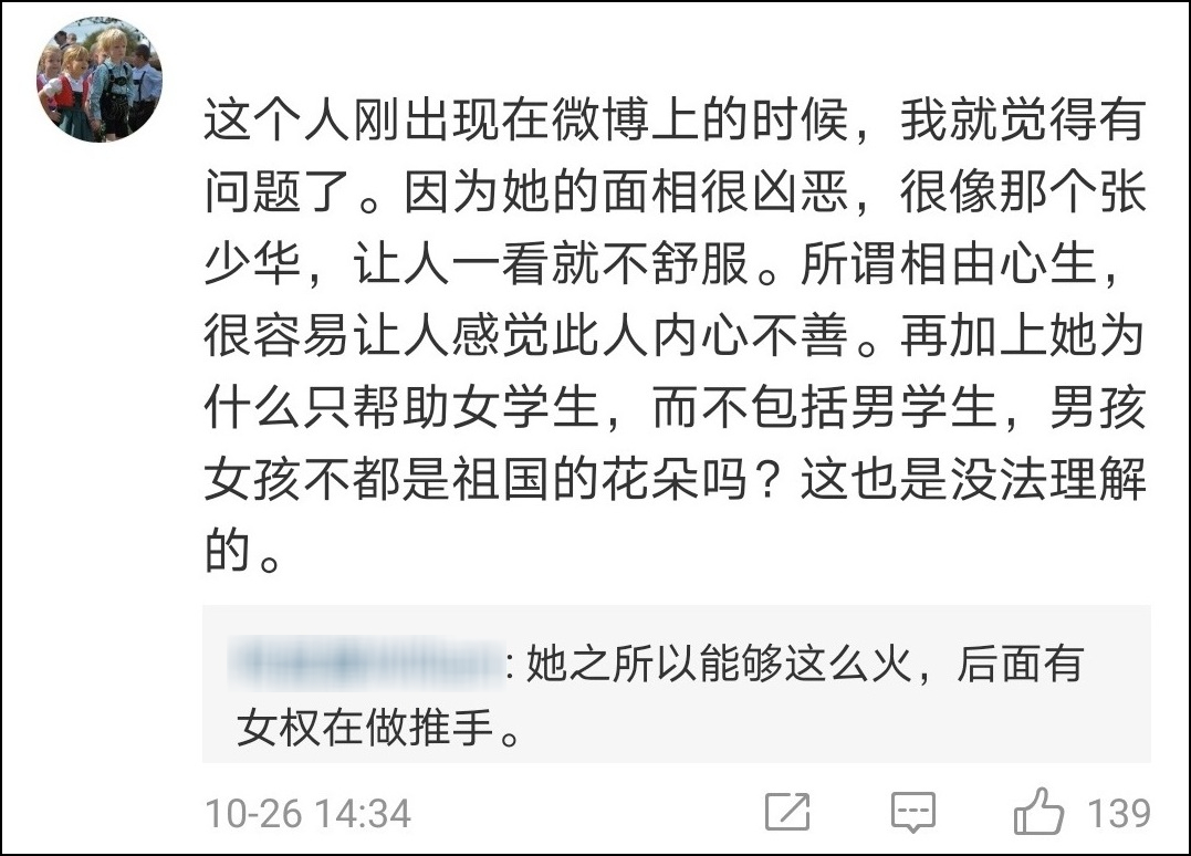 還認為,張桂梅能火,是有“田園女權”羣體在做推手。