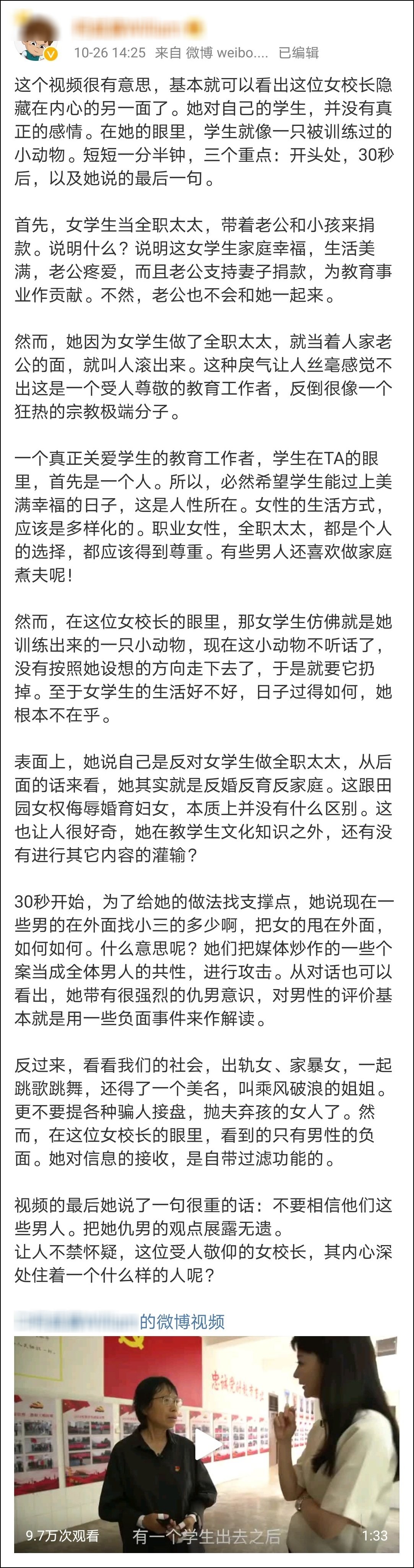 這位大V開篇即點明,他認為,通過張桂梅在視頻中説出來的話“基本就可以看出這位女校長隱藏在內心的另一面”。