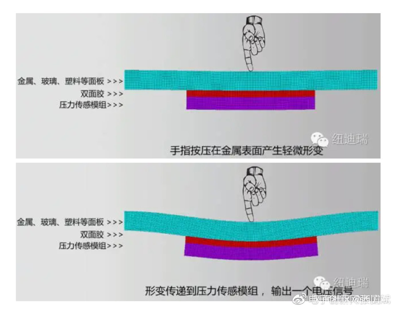 據他介紹,通過紐迪瑞科技(NDT)獨有的微壓力應變器材料(Micro Strain Gauge),直接檢測面板觸摸後所產生的微小形變,獲取觸摸位置及壓力大小。