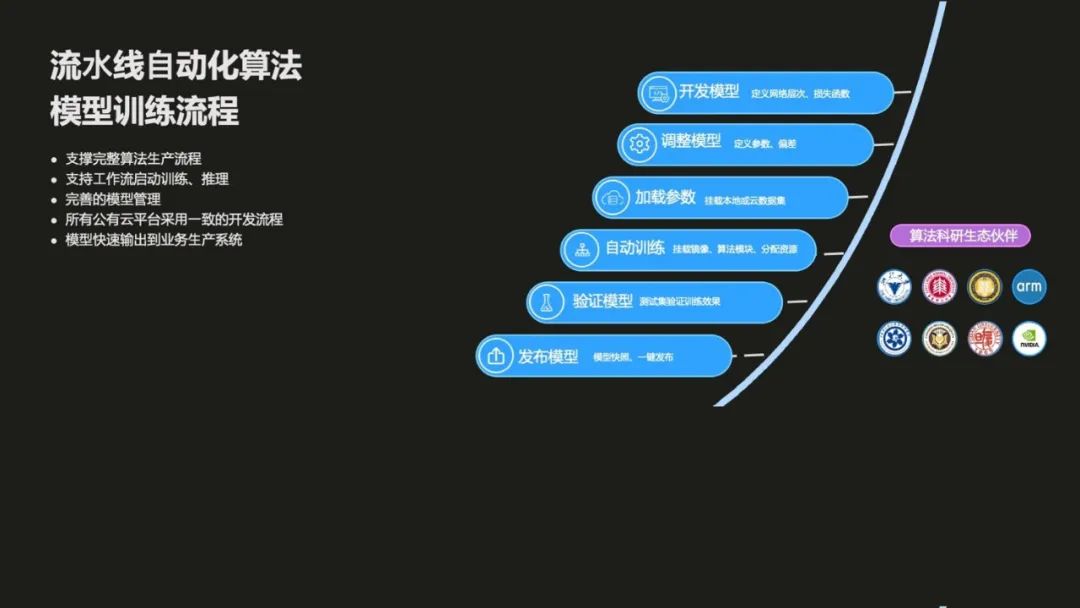 在這條生產線上——從生產的原料開始,數據的標註、加工;到核心算法開發人員,可以像工藝師一樣,非常方便地去調試算法、參數,去把人工智能算法放到這個平台上;再到它全自動地對模型進行檢測和評估,最後上線——其實是有非常多工序的。