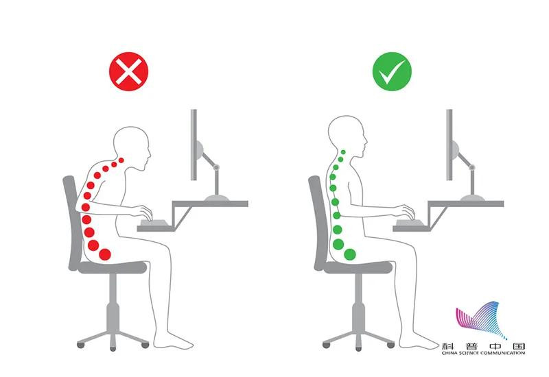 另外,人們常説的“挺胸抬頭”,實際上是不正確的,因為胸椎本來就是後凸的,過分“挺直”反而會影響正常的生理曲度。正確的坐姿,只要達到收起肚子就可以了。