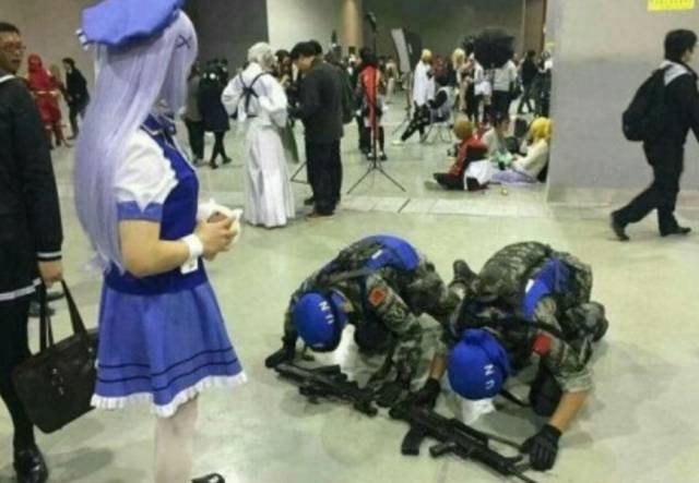 還記得此前,在某動漫展覽活動現場,兩名身着迷彩服、攜單兵裝具、頭戴維和部隊藍盔、臂上縫着五星紅旗的Cosplayer,雙膝着地,向一名日式打扮的“少女”下跪。