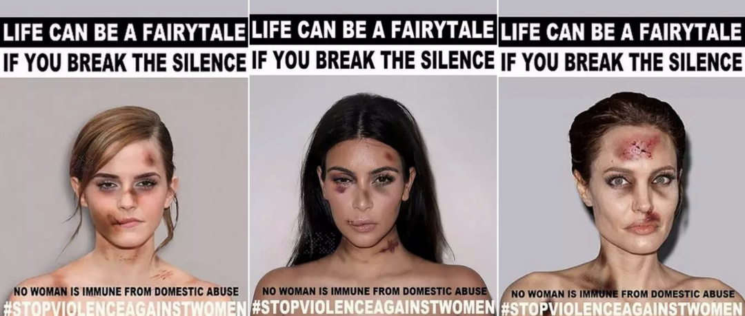 艾瑪·沃特森,金·卡戴珊,安吉麗娜·朱莉……被化妝成家庭暴力的受害者,以此呼籲更多的人關注家暴問題。