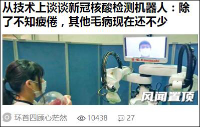 一篇“日本川崎重工研發新冠核酸檢測機器人系統”引起了不少觀友的興趣。有一位觀友看到沒人從技術上談談這個機器人的問題,於是便説了兩句。