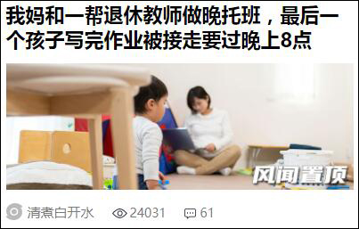 《我媽現在和一幫退休教師做小學生晚託班,最後一個孩子寫完作業被接走,要過晚上8點》——清煮白開水