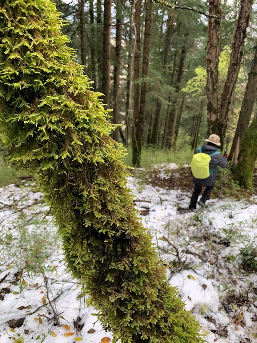 不過我們發現在這裏爬山有個好處:雖然坡陡,但是林下比較好走。我們選擇的都是一些森林植被質量很高的區域,這裏的森林主要由油松、雲杉、樺樹、楊樹、青岡等樹種構成。令人感動的是這裏樹的高度——在華北的山上,我們看一棵樹平視即可,很少能看到20米高的大樹,即便是華北豹漫步的森林裏,樹的高度也往往只有十幾米高,胸徑不過3、40釐米,然而在阿夏,我們身邊往往被高達30米以上的大樹環繞,它們的胸徑往往在1米以上,我們需要抬頭仰視它們。這些大樹森林的下方空曠平整,平時那些習慣於撕扯我們的灌叢在這裏很少,大樹的樹冠使得林下的植物很少有發展壯大的機會。