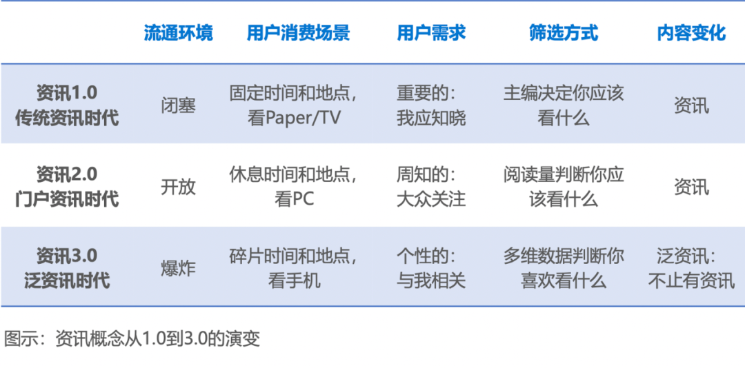 在泛資訊階段,用户信息接收方式和資訊內容生成方式均呈現去中心化特徵,跨媒介傳播成為常態。同時,用户對信息的訴求已不僅僅是簡單的清單式被動閲讀,而是逐漸趨於“興趣”和“相關”。