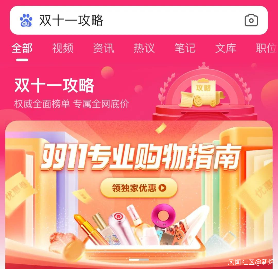 百度此次參加雙十一的方式,不只是給自己賣貨,也給別的電商平台「搭橋」。比如百度關鍵詞「雙十一攻略」,就會出現百度搭建的電商整合版塊,版塊內包含必買清單、熱門榜單等,幫助用户直達好物,省掉「做功課」的時間成本以及試錯成本。