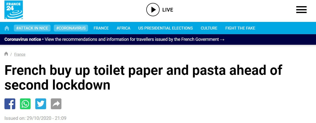 法國媒體France 24報道《法國人在第二次封鎖前搶購廁紙和意大利麪》