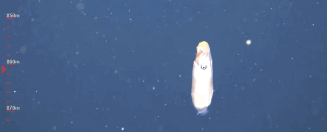 除了這次罕見的偶遇,鏡頭中還有一個特別令人驚訝的地方:這隻卷殼烏賊的頭和觸角是在直立漂浮,它的鰭指向下方。
