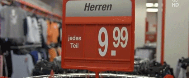 在德國商場裏,牛仔褲的價格低至9.9歐,對於當地人來説是真·白菜價。