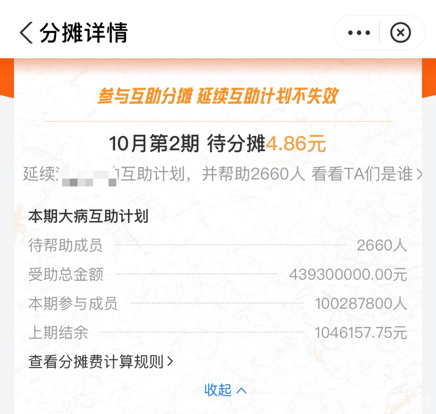 10月28日是相互寶的扣款日,打開公示一看,本期救助2660人,分攤金4.86元,比上一期4.23元多了6毛3分錢。