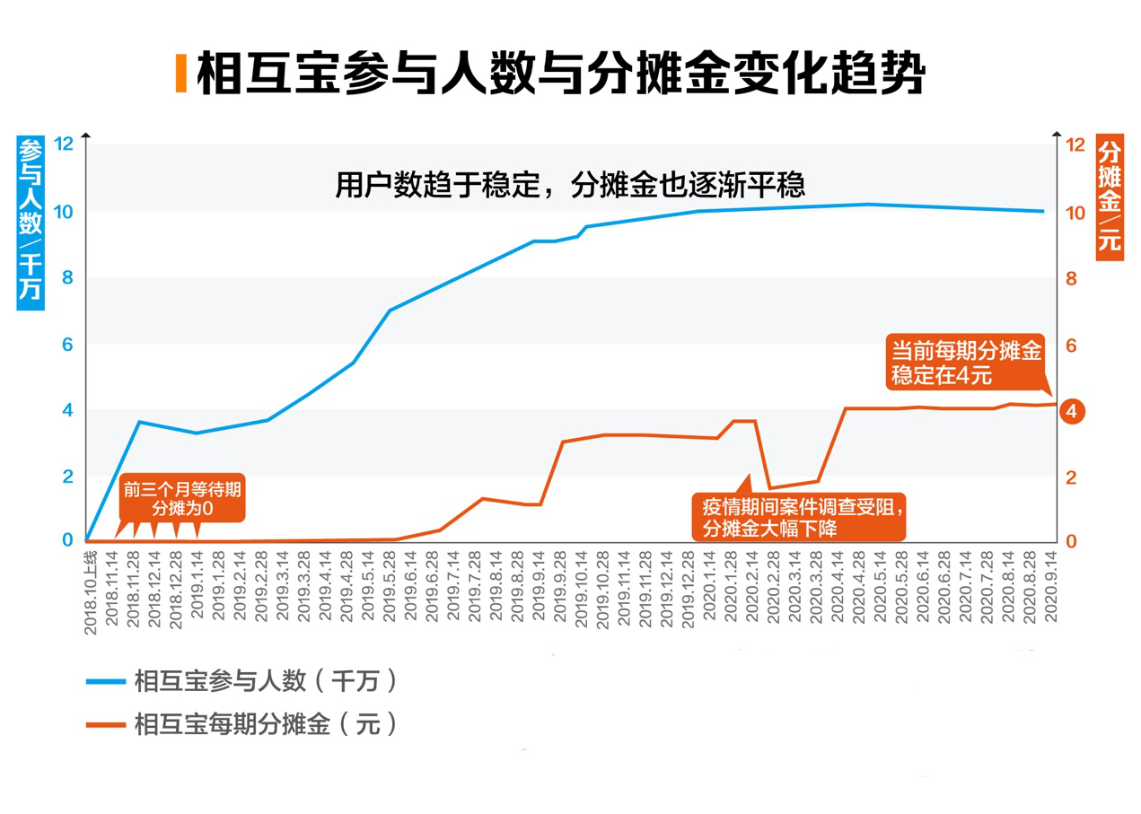 雖然重疾的確診和理賠被疫情阻礙,但重疾的發生不會因為疫情而減少。所以五六月疫情緩解後,相互寶的分攤金又慢慢回升了,因為積壓的案件釋放了出來。8月開始,相互寶的分攤金基本在4元以上,且在4.2元左右徘徊。