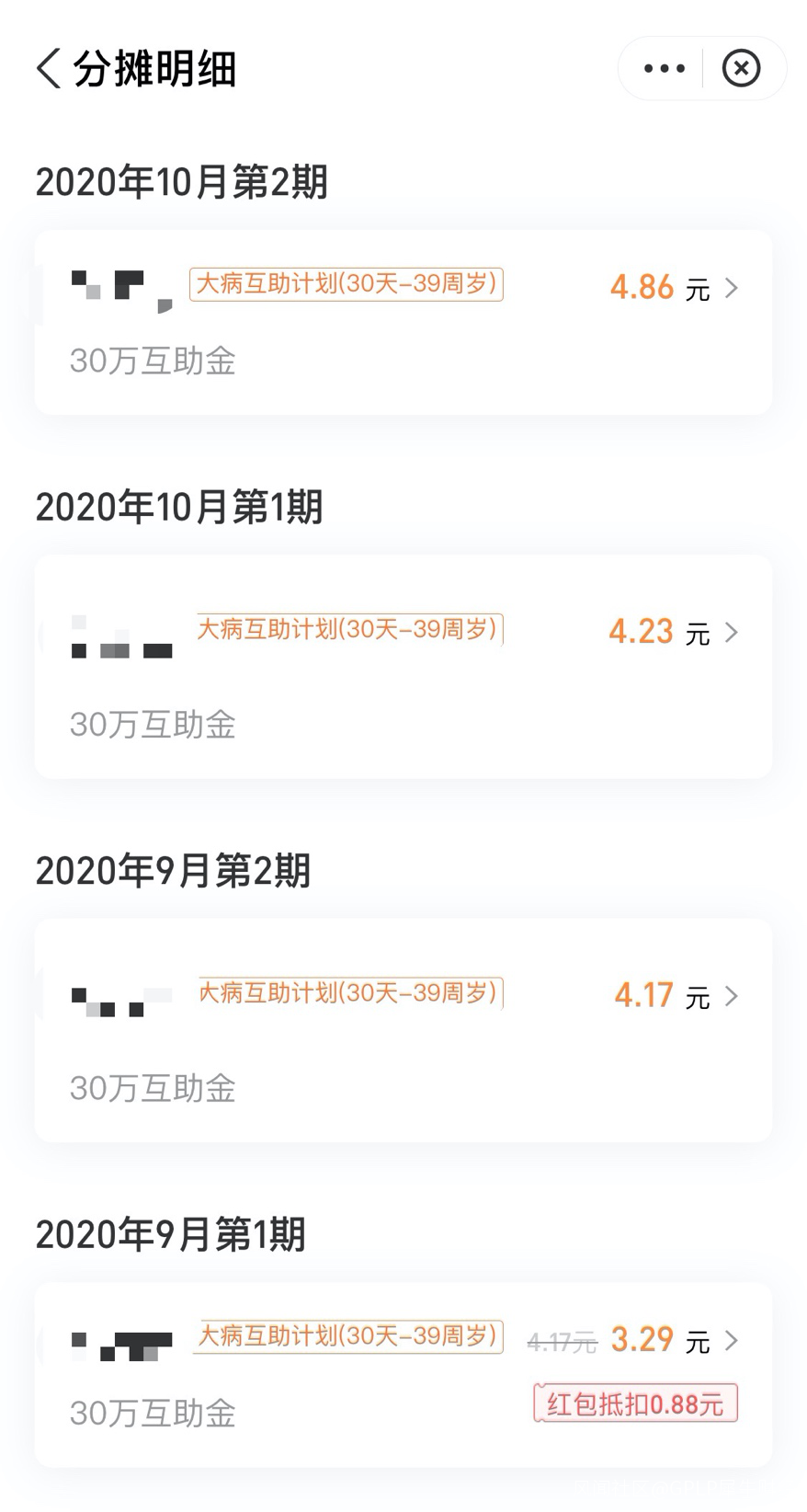 這是本人最近幾期的分攤明細:雖然一次就四五塊錢,但用户心理上的失去感肯定是有的。總結一個觀點:保險最難的問題是怎麼把產品賣出去,相互寶最難的問題是怎麼把客户留住。