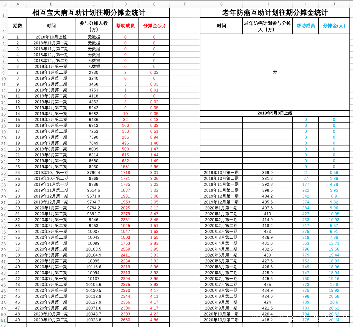 為此我統計了相互寶每一期的參與分攤人數、救助成員和分攤金。這些信息其實在相互寶的公示頁面也都能查得到,統計起來不難,就是要有耐心。