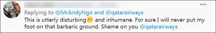 這種行為讓人不安,也極不人道。“永遠別想抬起頭,卡塔爾航空公司”。