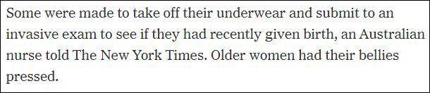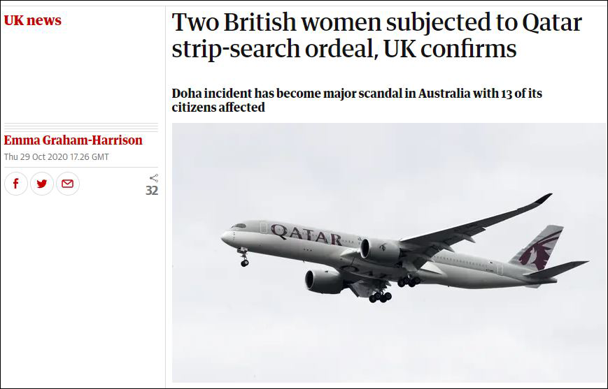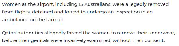 一位澳大利亞護士事後對《紐約時報》表示,卡塔爾方面“侵入式檢查”了年輕女乘客的身體,以確認其近期是否分娩過;而對於老年乘客,檢查人員則按壓了她們的腹部。