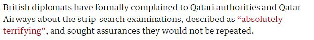 據英國《衞報》(The Guardian)29日的消息,英國方面已經確認,兩名英國乘客遭受了同樣的“強制檢查”。法新社表示,在QR908航班上,就有一名法國婦女。