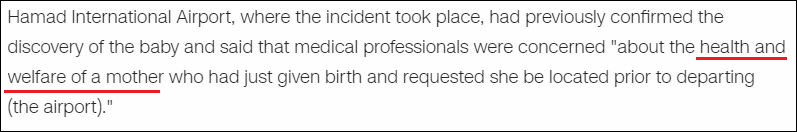 對於此事帶來的壓力,卡塔爾方面卻只是強調事件源於機場廁所內的棄嬰。他們表示,經過機場人員的努力,這名嬰兒剛剛從一場駭人的殺人行為中獲救。“在卡塔爾的照料下,嬰兒很安全。”