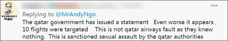 還有網友表示,共有十趟航班出現了這樣的事,這不是航空公司的問題,這是卡塔爾政府授權的性侵。