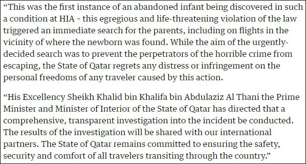 對航班上的乘客進行強制檢查,卡塔爾方面稱,這只是在搜尋棄嬰的父母,畢竟他們違反了該國的法律。由此帶來的困擾或者侵犯,卡塔爾當局“表示遺憾(regrets)”。