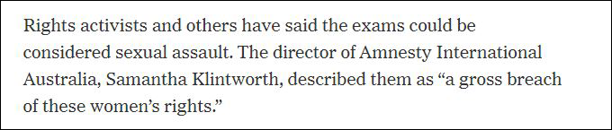 《紐約時報》表示,在維權人士看來,卡塔爾當局的行為名為檢查,實為性侵(sexual assault)。澳大利亞人權組織AIA(Amnesty International Australia)的領導人,薩曼莎·克林特沃思(Samantha Klintworth)直言,這樣的行為嚴重地侵犯了女性的權利。