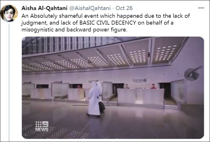 來自卡塔爾的社會活動家艾莎·卡塔尼(Aisha Al-Qahtani )在社交媒體上表示,卡塔爾的行為缺乏基本的判斷力和禮儀廉恥。