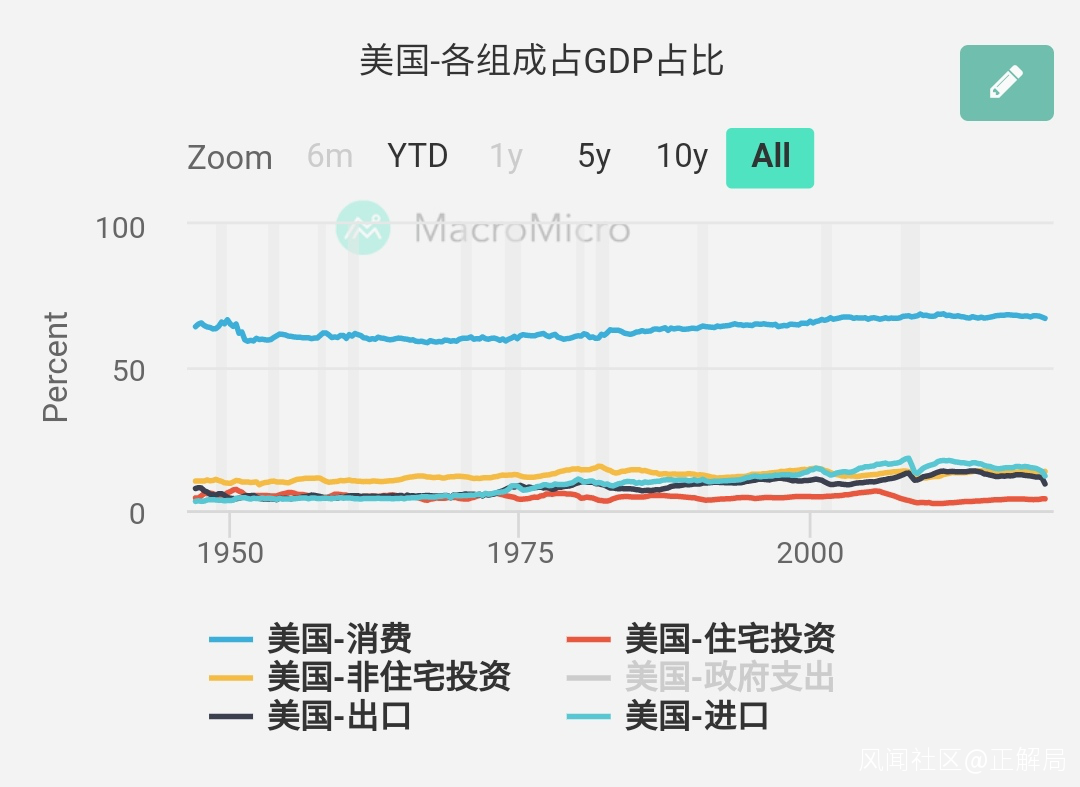 所以,美國的GDP增長,主要還是由消費拉動。事實也如此,消費佔美國GDP的比重,接近七成。