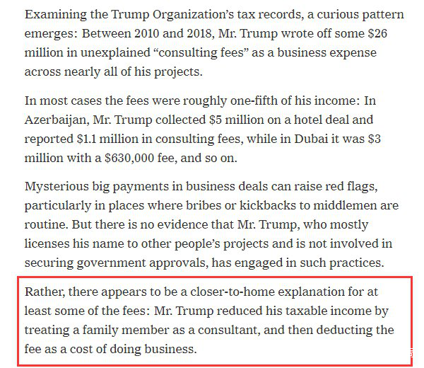 還有神秘的諮詢費。據《紐約時報》報道,2010至2018年間,特朗普在其商業開支中有一大筆可疑的諮詢費,幫他扣掉了2800萬美元的税費。