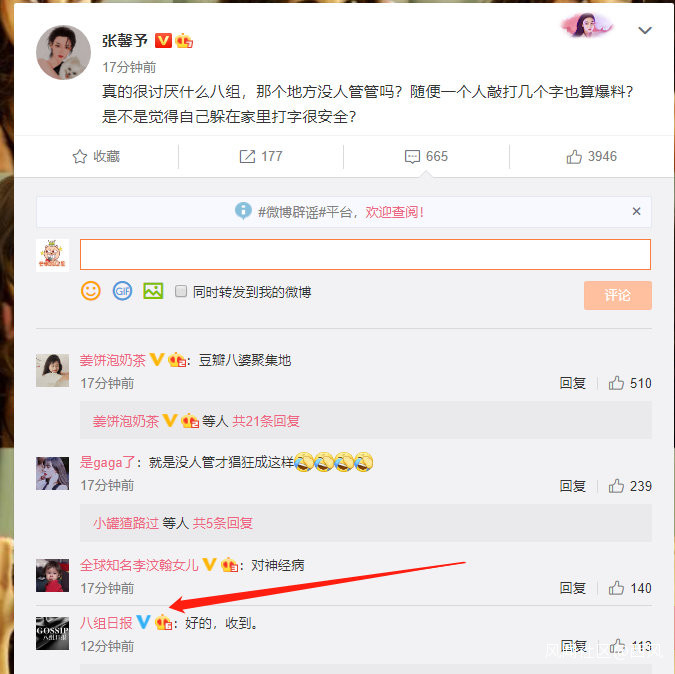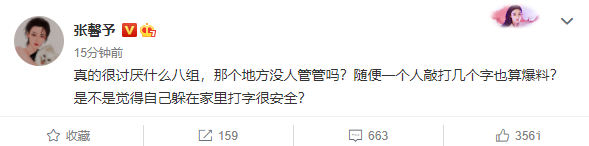 昨晚,張馨予在微博發帖吐槽,“真的很討厭什麼八組,那個地方沒人管管嗎?隨便一個人敲幾個字也算爆料?是不是覺得自己躲在家裏打字很安全?”