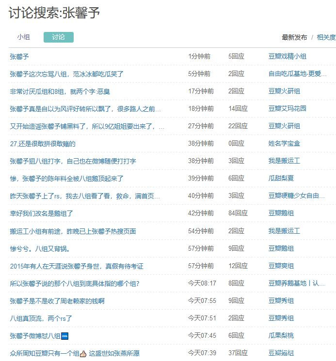 昨晚,演員張馨予在微博公開diss豆瓣知名八卦爆料小組:“真的很討厭什麼八組,那個地方沒人管管嗎?”隨後,豆瓣小組中張馨予的討論度瘋狂上升,其“黑料”接連被扒。