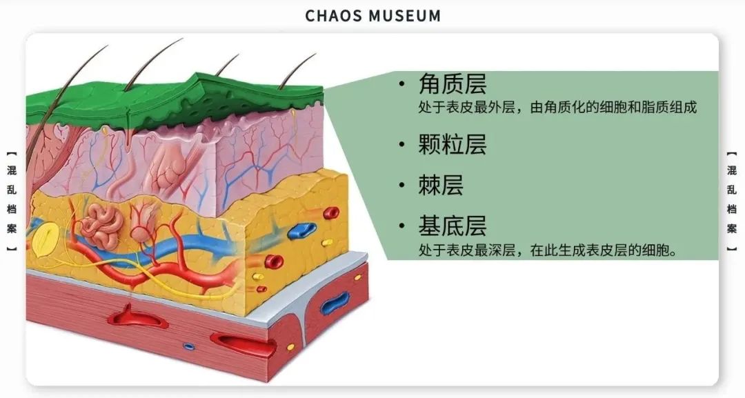 而再上層的表皮層作為身體的屏障,新陳代謝非常快,細胞從基底層增殖並逐漸向上層移動,最終成為最上層角質層的沒有細胞核的細胞,只需要短短28天左右。