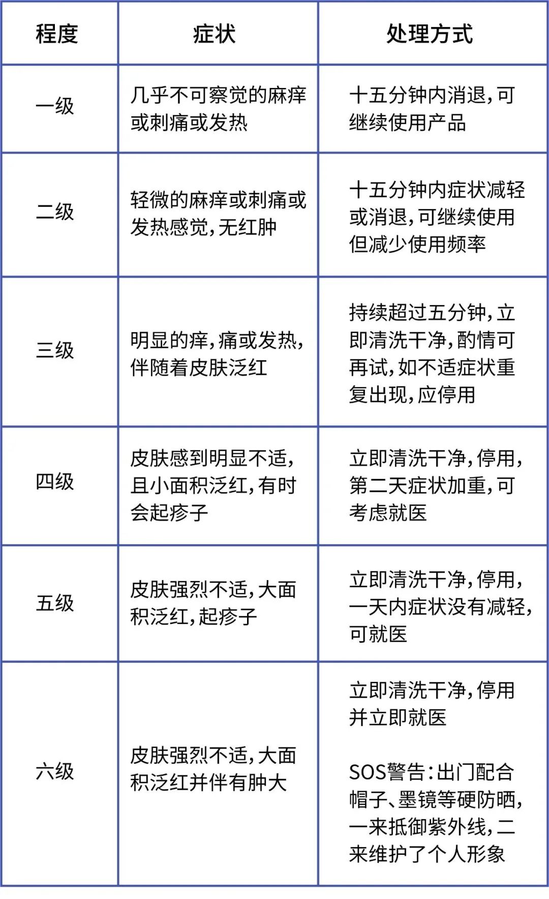❗注意:假如癢痛明顯,且持續時間長,或者出現明顯的發熱發紅現象,甚至出現紅腫水泡,**不用猶豫,沖洗乾淨。**這是因為某個成分對皮膚有致敏作用,繼續使用,會加重免疫反應,四級以上要考慮就醫治療。