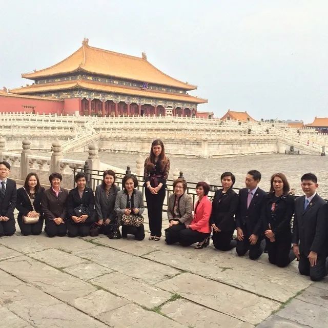 2001年泰國朱拉蓬公主訪華,在參觀故宮留影時,隨行人員必須下跪拍