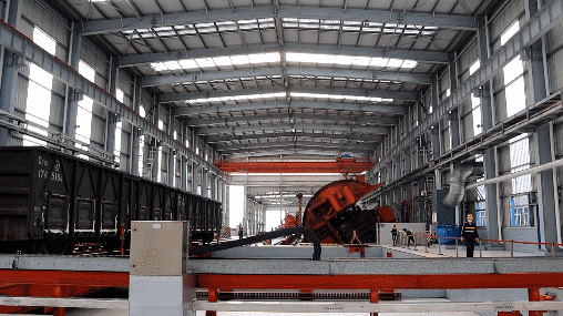 這裏使用的翻車機可以在20秒內一次翻卸4輛載重80噸的C80車輛,大大提高了作業效率,有效保證重載列車快卸快運。