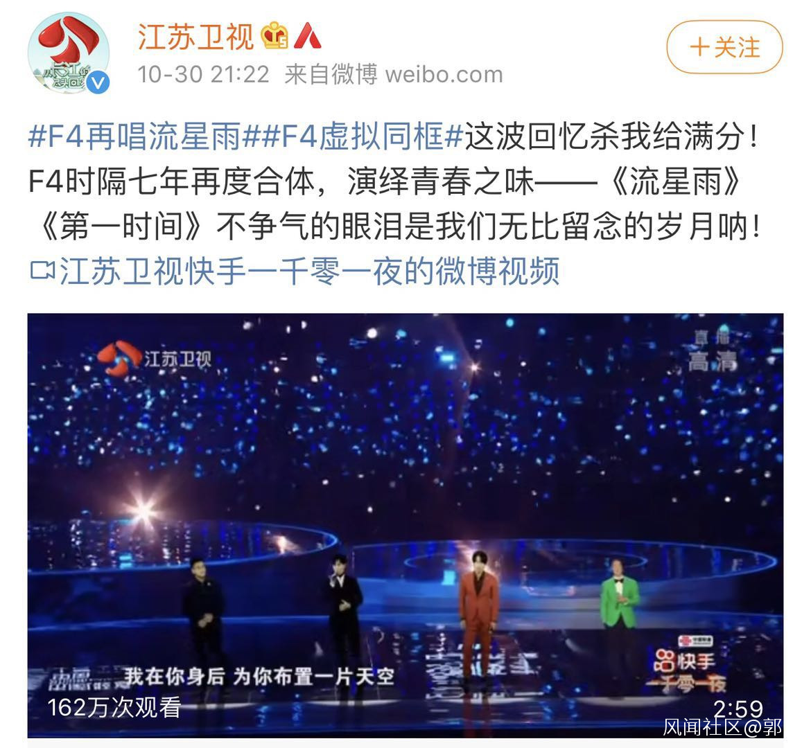 昨天(30日)上午,江蘇衞視官方發佈的當晚《一千零一夜》晚會節目單中,第12個就是F4演唱《流星雨》《第一時間》,如此安排讓一眾粉絲摩拳擦掌、期待不已。