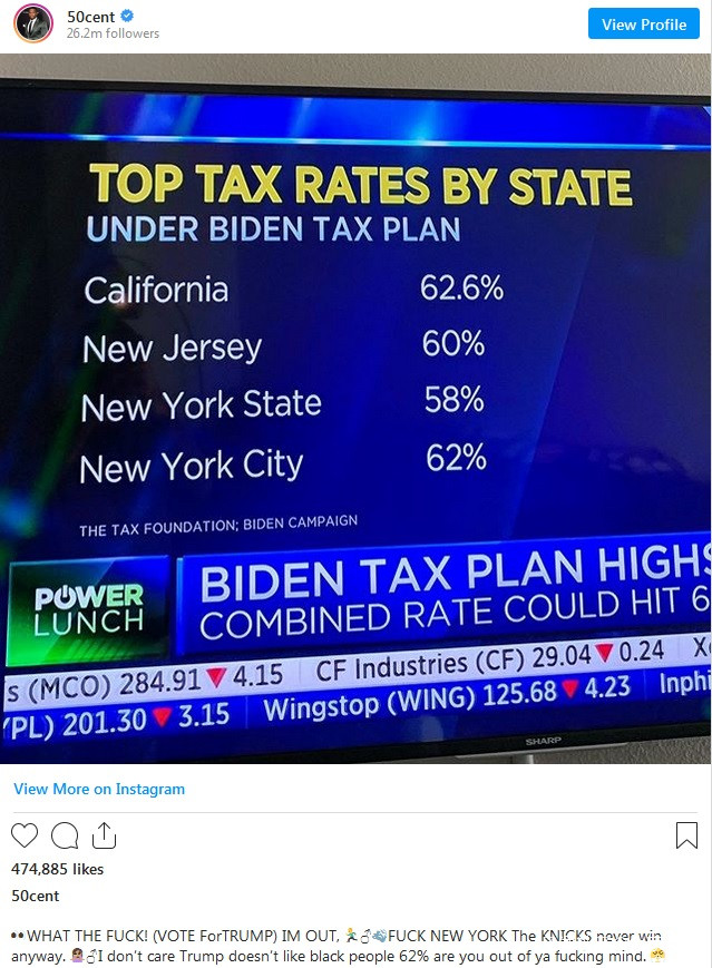 今天早些時候,這位嘻哈藝術家發佈了喬·拜登擬議的税收計劃的屏幕快照,該截圖顯示,他故鄉紐約市的富裕居民必須繳納62%的税率。在一個滿載表情符號的標題中,他寫道:“他媽的(投票支持特朗普)我不玩了…他媽的紐約,尼克斯無論如何都贏不了……我不在乎特朗普不喜歡黑人,62%,你是不是他媽的瘋了。”