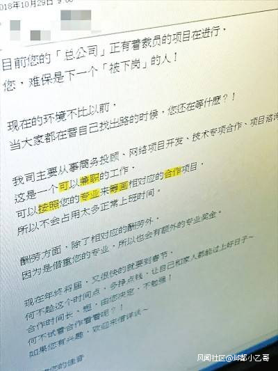 對方稱,“尊敬的劉欣,你好!我公司主要從事商務投資、網絡項目開發、技術專項合作、項目諮詢顧問等,這些可以兼職的工作,不會佔用太多正常上班時間”。在酬勞方面,對方特意説,“除了相對應的兼職酬勞外,因為借重您的專業,所以會有額外的專業獎金……”