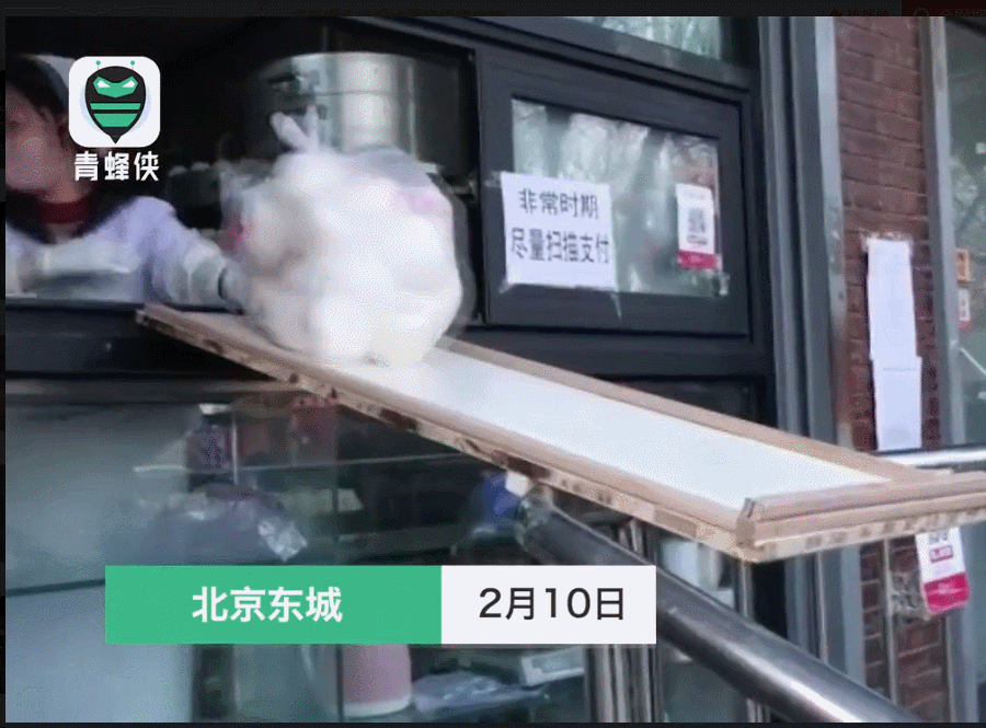 早在2月10日,北京安定門的鼓樓饅頭分司廳衚衕店,就為面對面交易想出了妙招:在窗口和護欄之間,搭上一道小“滑梯”,兩側和底部還特意加上木板隔擋。