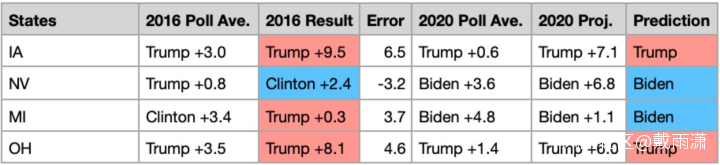 愛荷華、內華達、密歇根和俄亥俄4個搖擺州的2016選情和2020預測