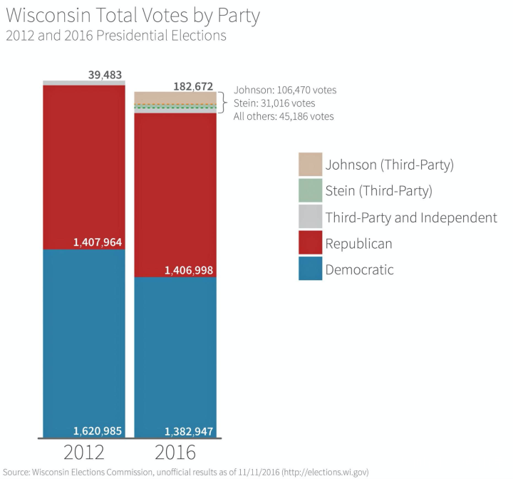 2012和2016年威斯康辛州的兩黨選民對比,共和黨人數基本持平,民主黨少了關鍵的二十多萬人(WEC)