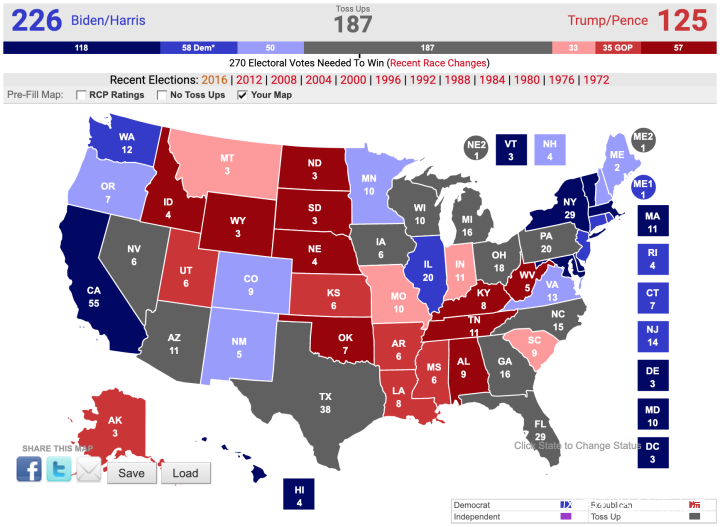 綜合各州的投票歷史記錄和目前的統計數據,2020大選兩黨的基本勢力如下圖所示。排除圖中兩黨支持差距較為懸殊的19個藍州和20個紅州以及分別只有一張選舉人票的緬因第二國會選區和內布拉斯加第二國會選區,剩下11個圖中標記為灰色的州將會決定這屆選舉的最終結果。