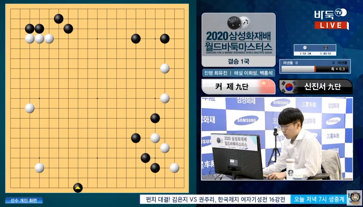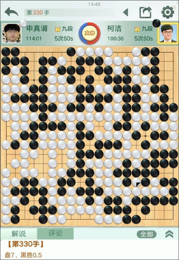 隨後,柯潔下了一步求穩棋,能還回來5目,但一來一去申真諝還是虧了5目。