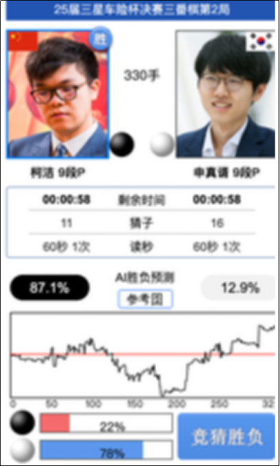 在第二局棋裏,中盤柯潔局勢不錯,但在下半盤下出昏招,其AI測算勝率一度跌至3.3%。