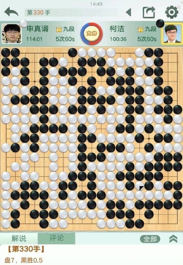 弈至330手,申真諝按下“認輸鍵”,柯潔半目險勝。
