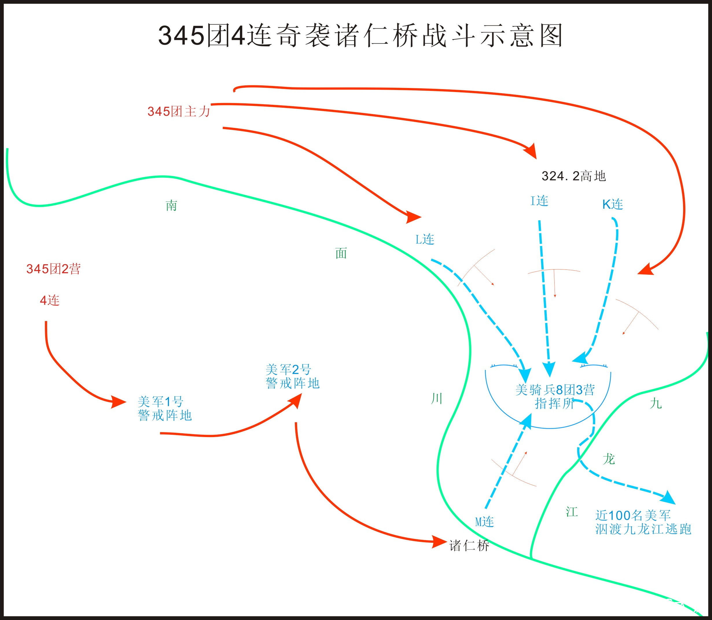 我們都知道,抗美援朝戰爭中,志願軍1個團想要包圍殲滅美軍1個營是有相當難度的。345團4連奇襲諸仁橋的戰鬥,原本的任務只是切斷美軍退路。但為了配合主力作戰,4連主動向絕對優勢的美軍發起勇猛衝鋒,一戰而搗毀美軍騎兵8團3營指揮所,打掉了美軍指揮中樞,導致美軍騎兵8團3營一片混亂,遂被345團成功包圍於324.2高地以南,南面川以北,九龍江以東方圓1公里的狹小區域內。4連一戰而定乾坤。我為什麼要寫這段話,是因為我軍並不知道美軍指揮所被4連搗毀,這是決定此戰走勢的關鍵。這一殊榮,我們沒記載,但美國人記載了。所以要把這一殊榮還給4連。