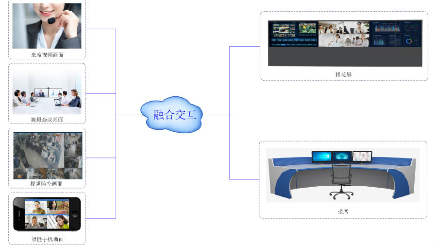 在現代化指揮中心、調度中心等應用場所,通訊手段多樣化,包括視頻會議系統、視頻監控系統、錄製點播系統、電話語音系統等。傳統的應用中,各個系統之間是相互獨立的,在展示上不能有效聯動,同時需要多套操作系統,需要多人協作才能完成應用操作。