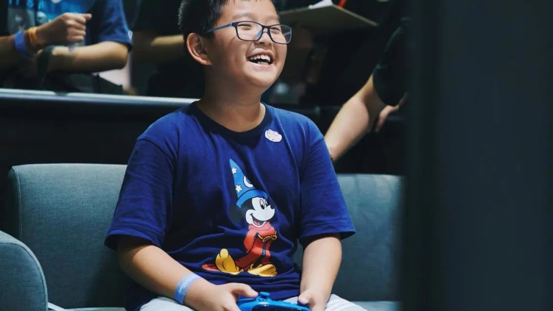 在 Dice 展會上游玩《Party Animals》的小男孩