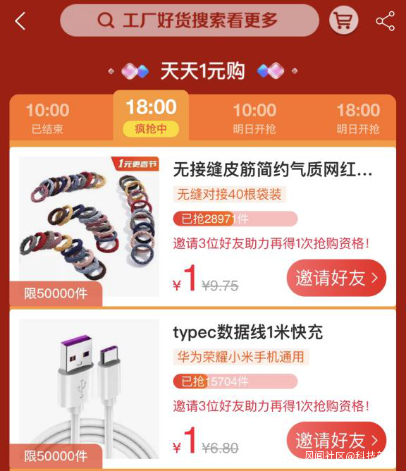 目前,「天天一元購」版塊每天上架8款左右的商品,一元包郵,限時限量搶購,但是對於消費者的購買次數有一定的限制,當用户下完一單之後,無法繼續下單,除非邀請3位好友助力,才能獲得繼續下單的資格。